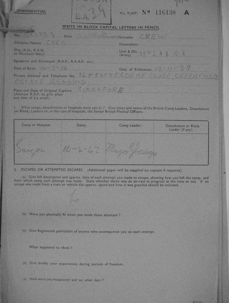 Permission was given to photograph the first page only of the Liberation Questionnaires and we could use these photographs on the COFEPOW website on the understanding that we didn’t accept any payment for viewing them.